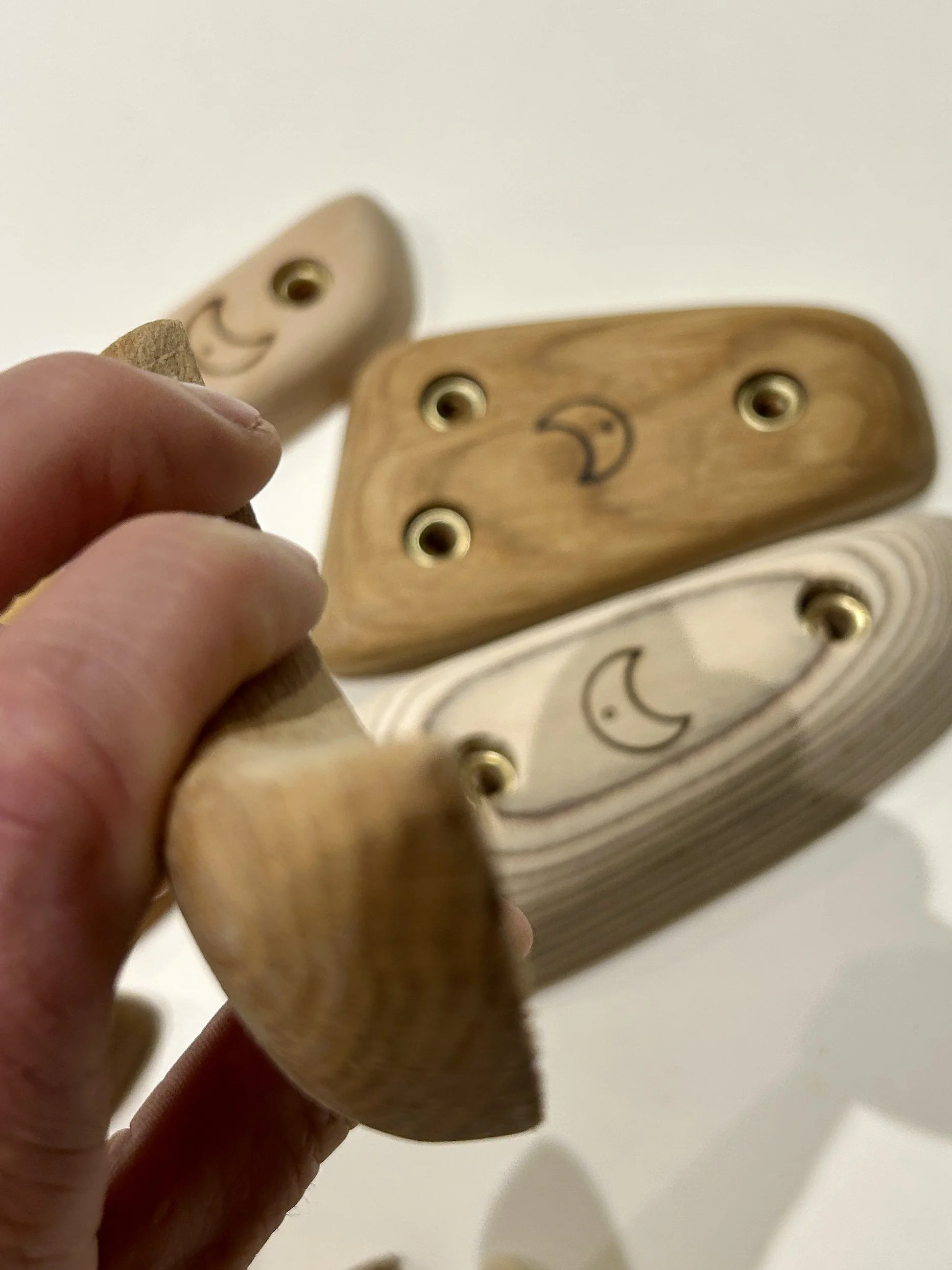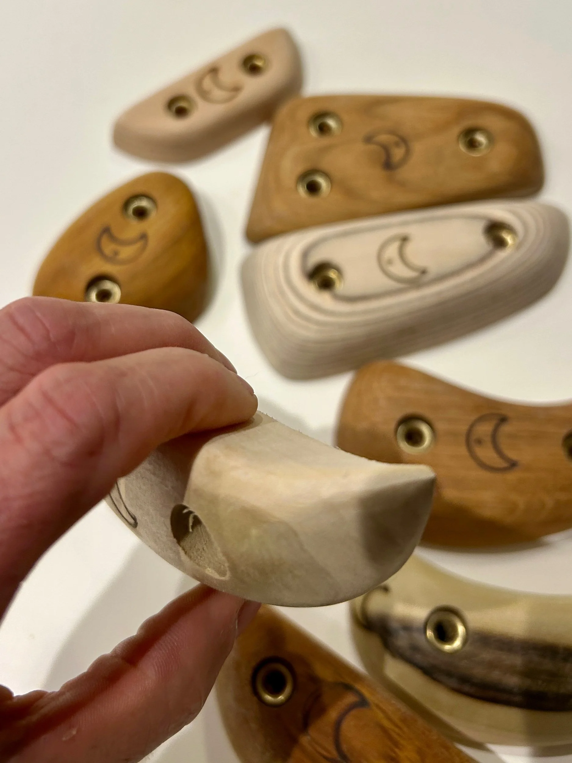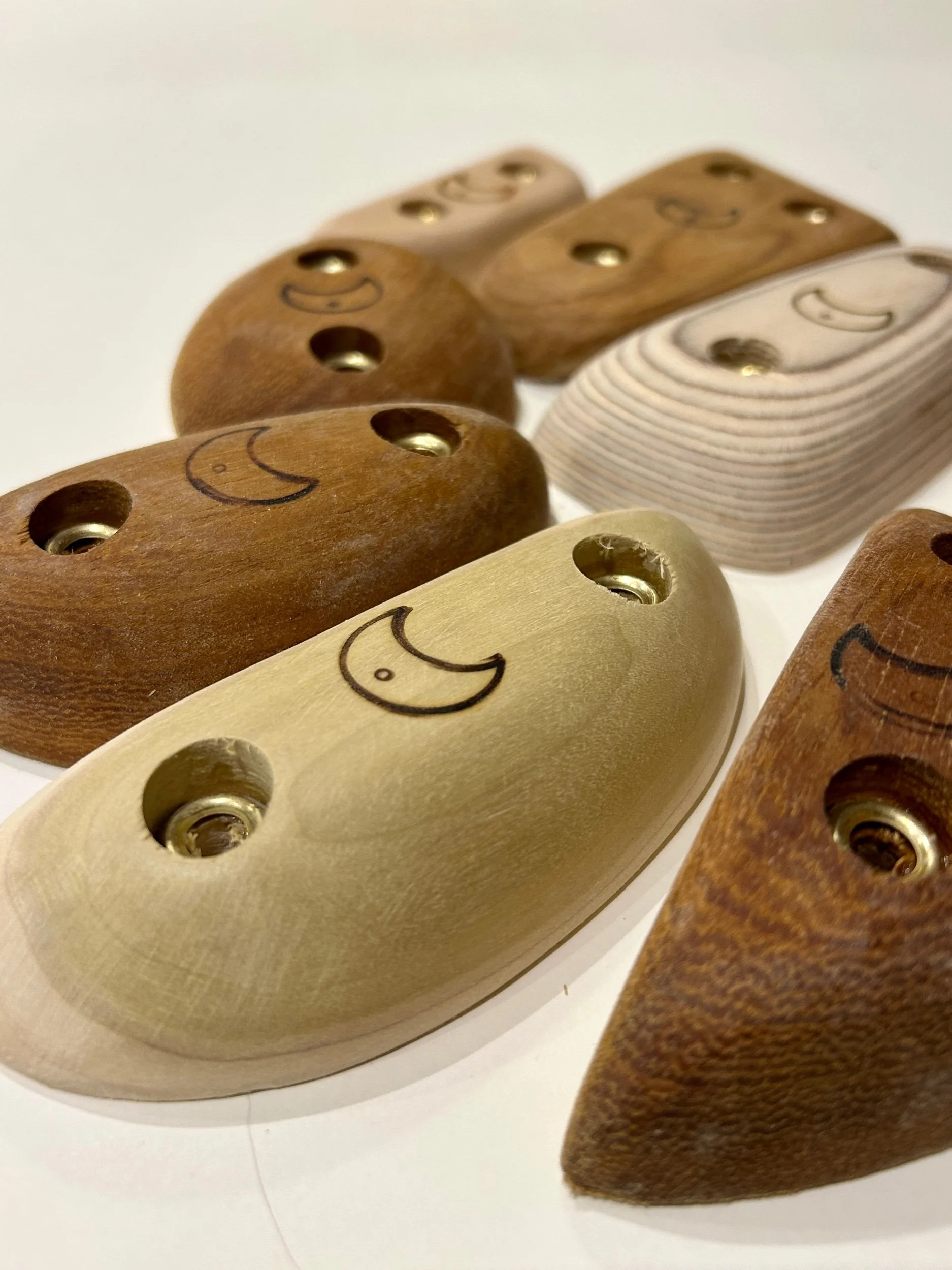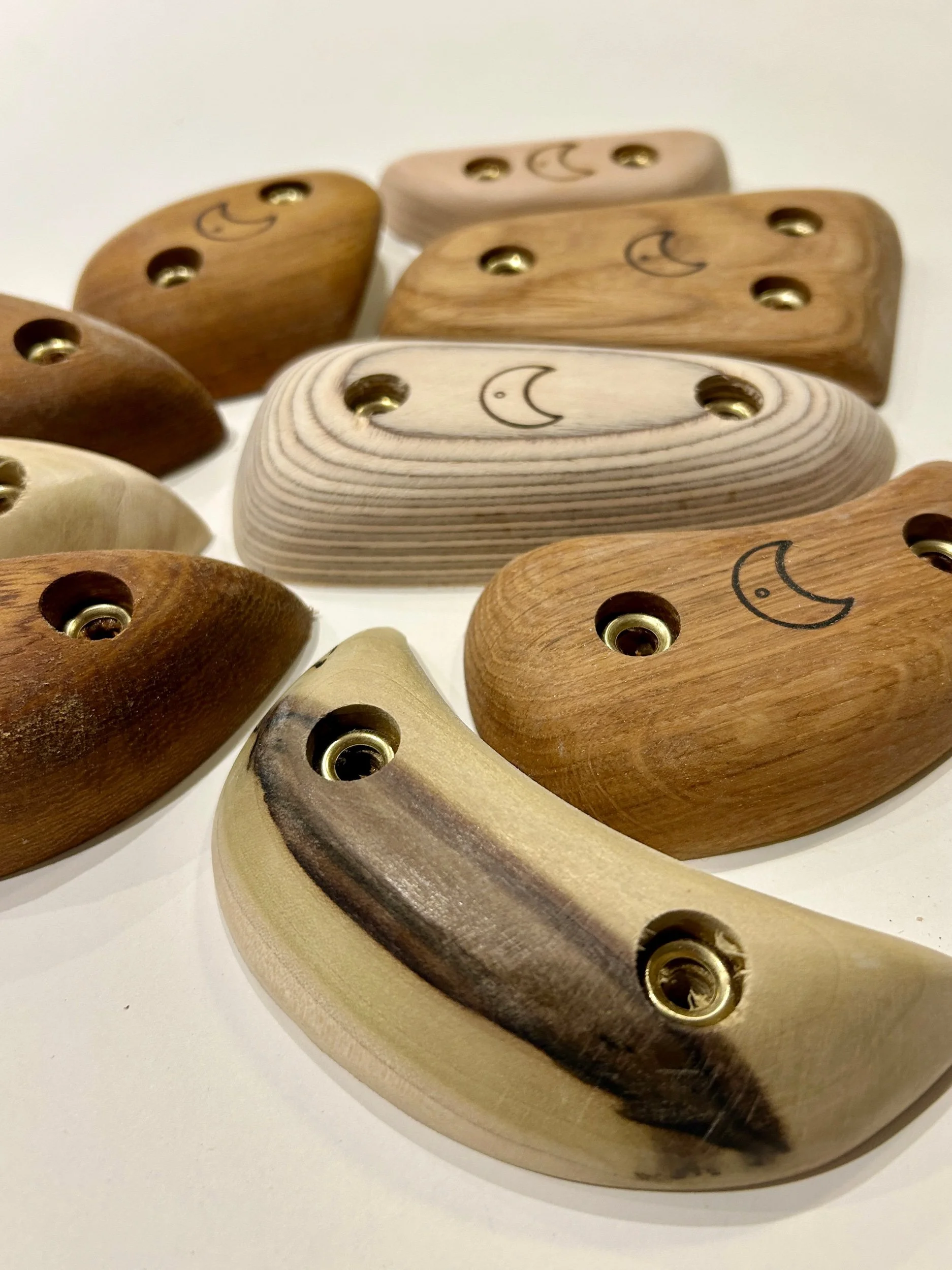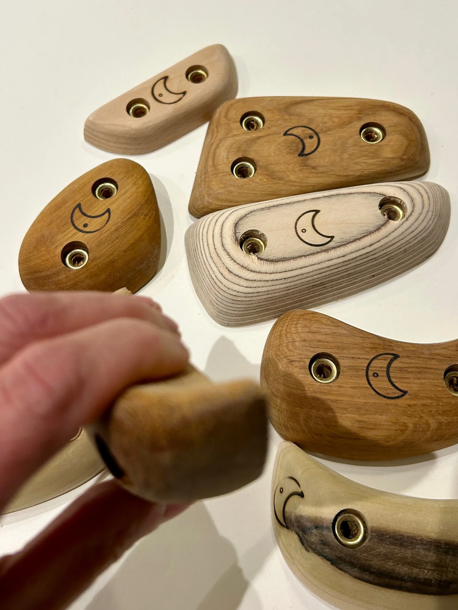 Beautiful handmade wooden climbing holds, brushes and training equipment.