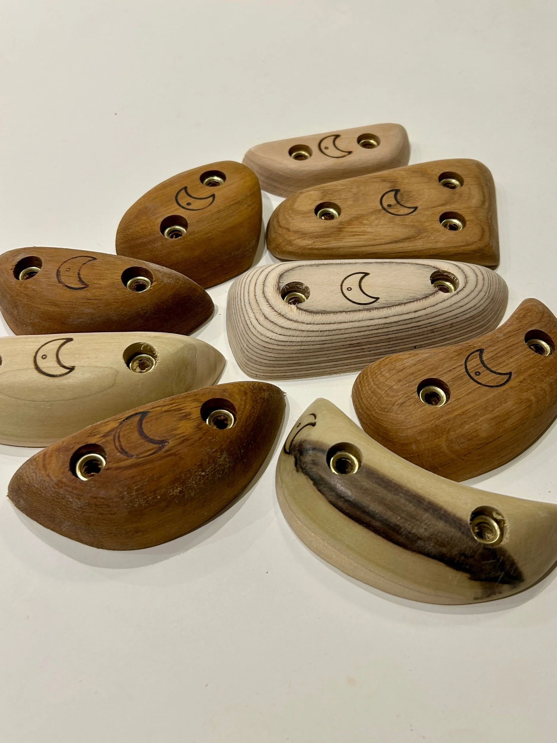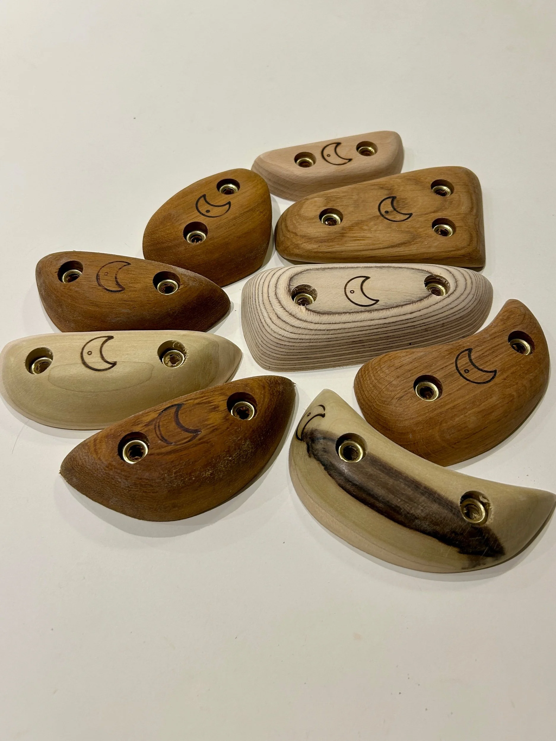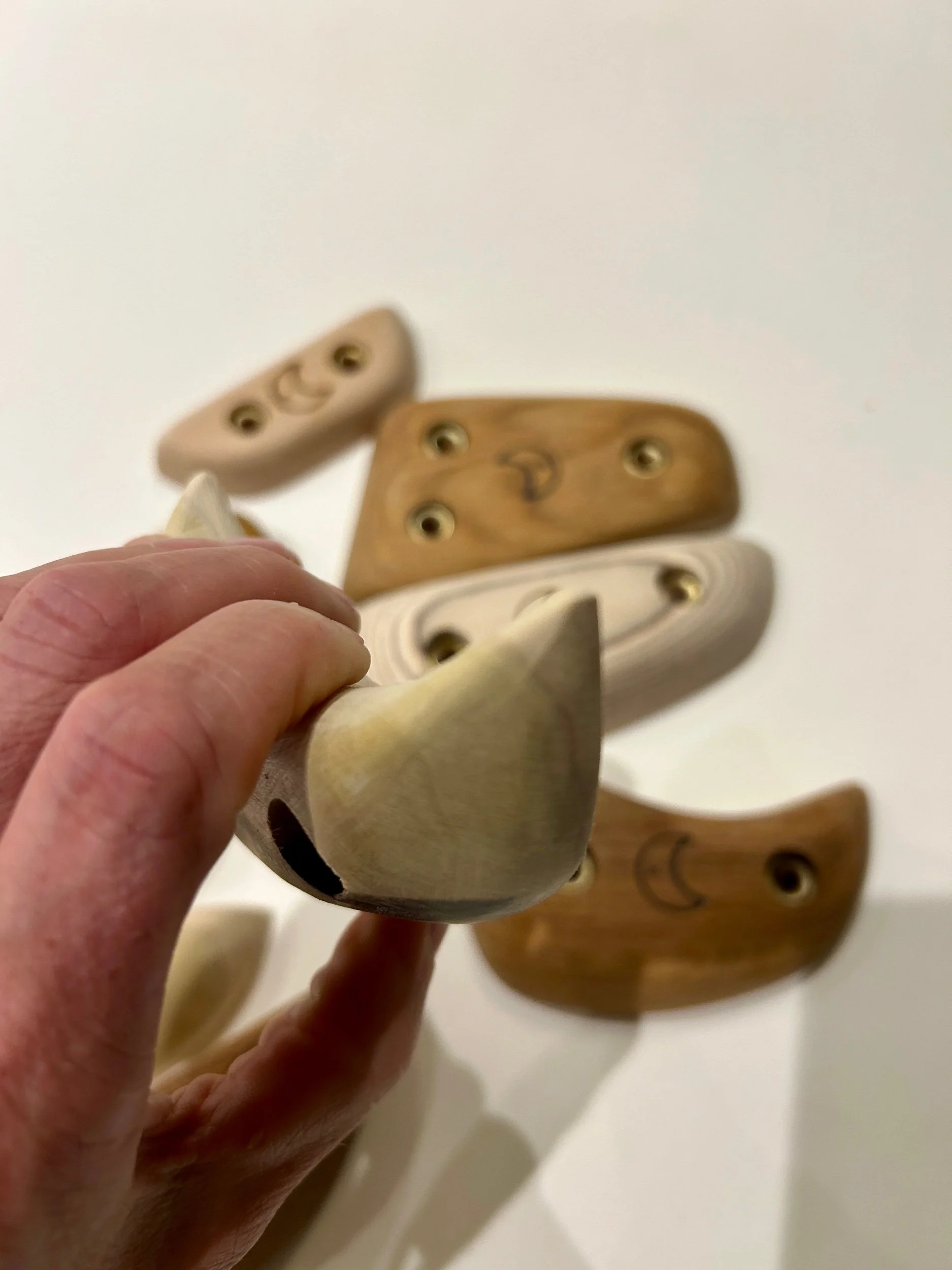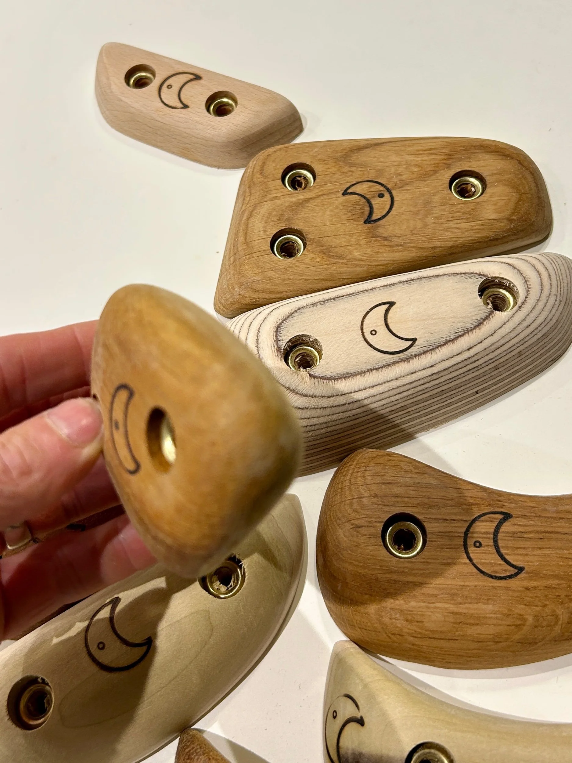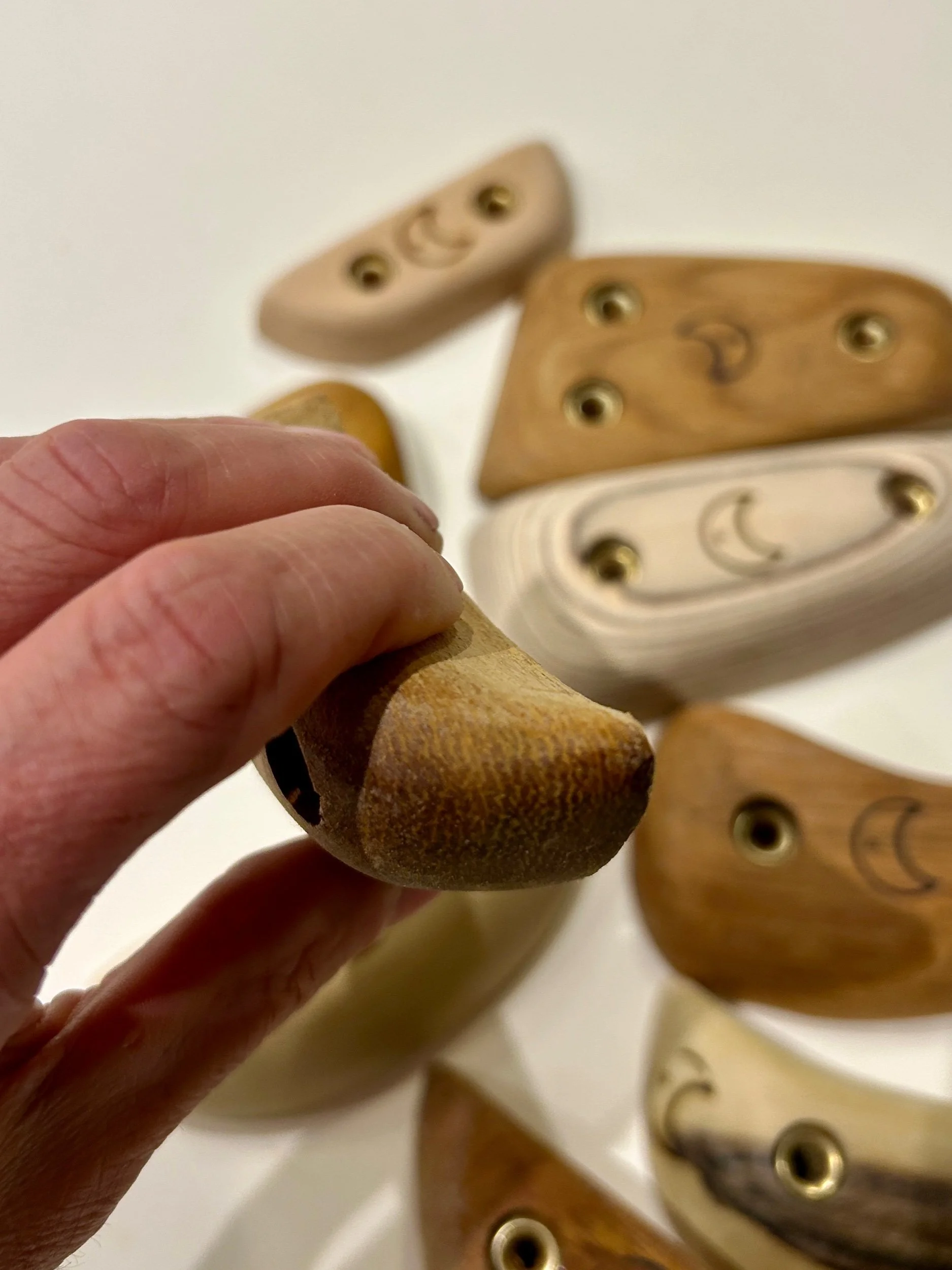 Beautiful handmade wooden climbing holds, brushes and training equipment.