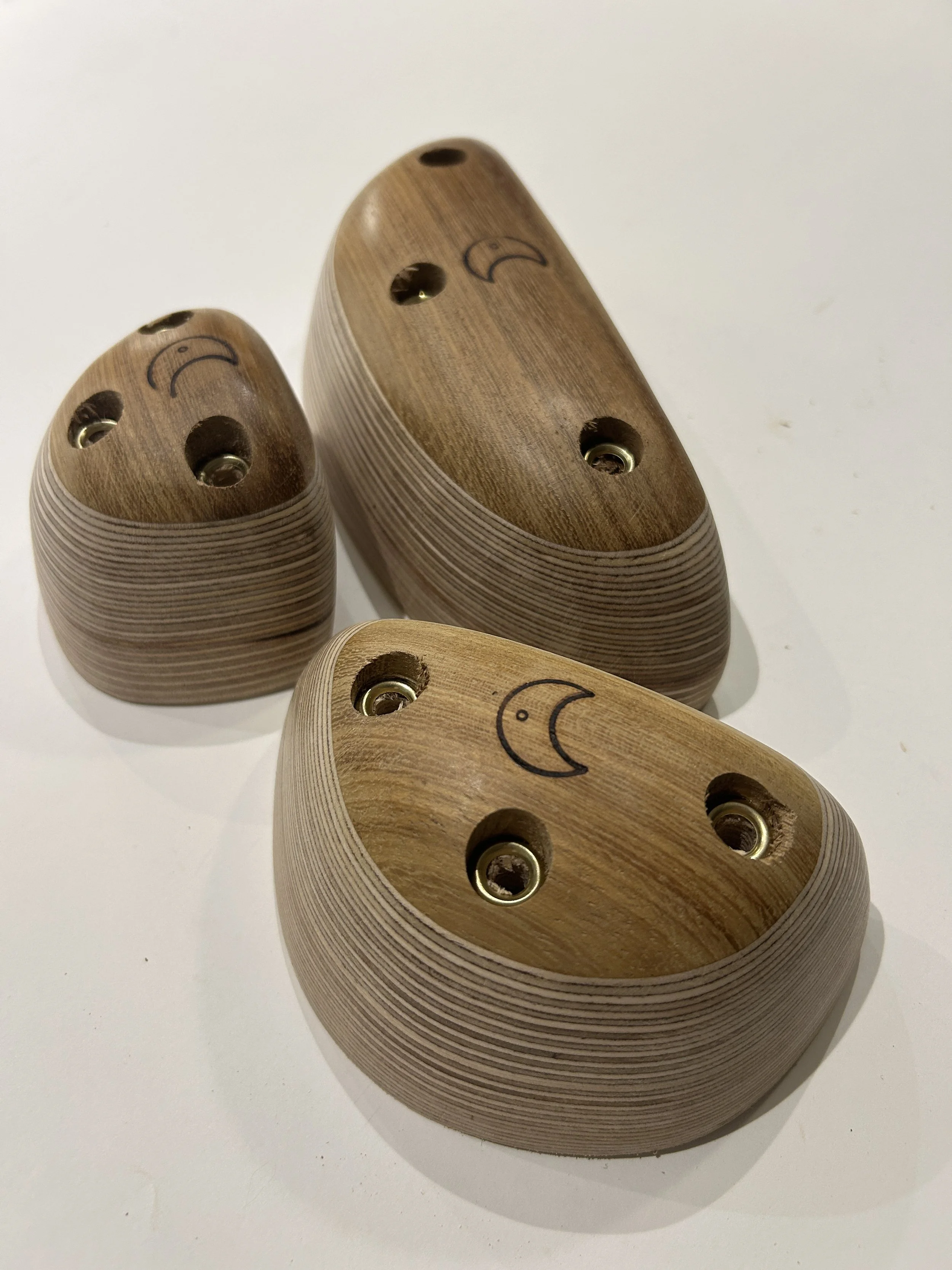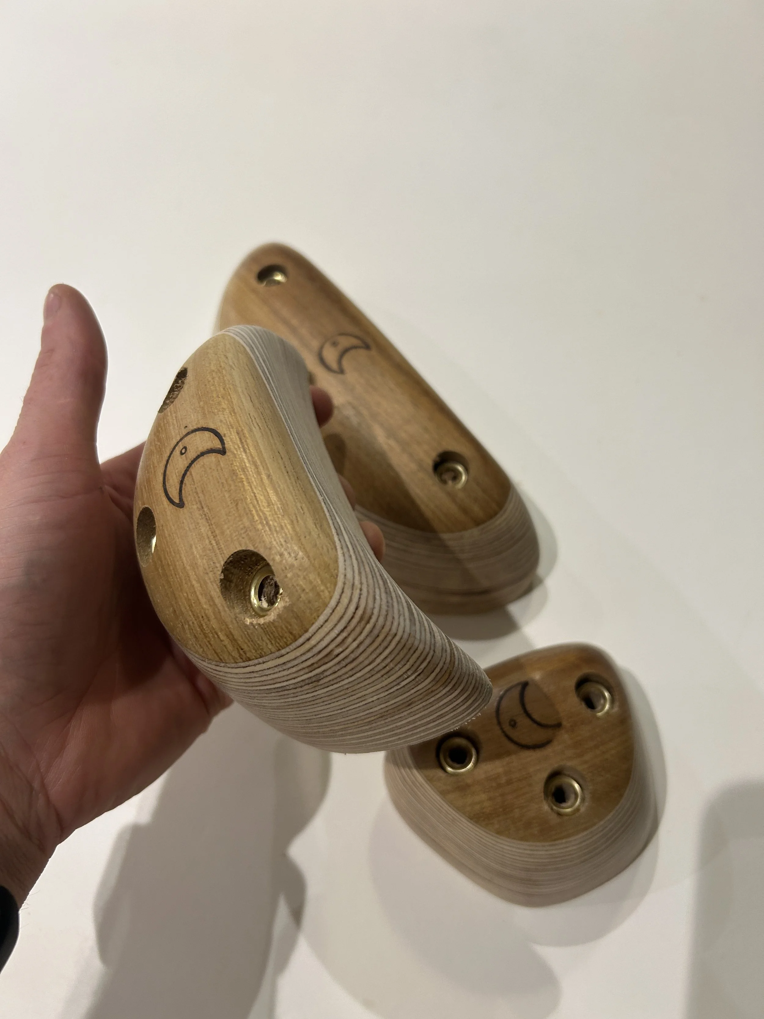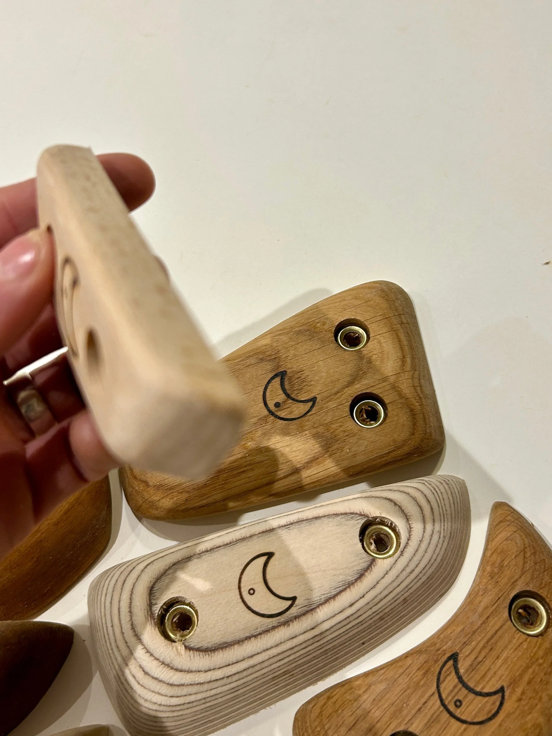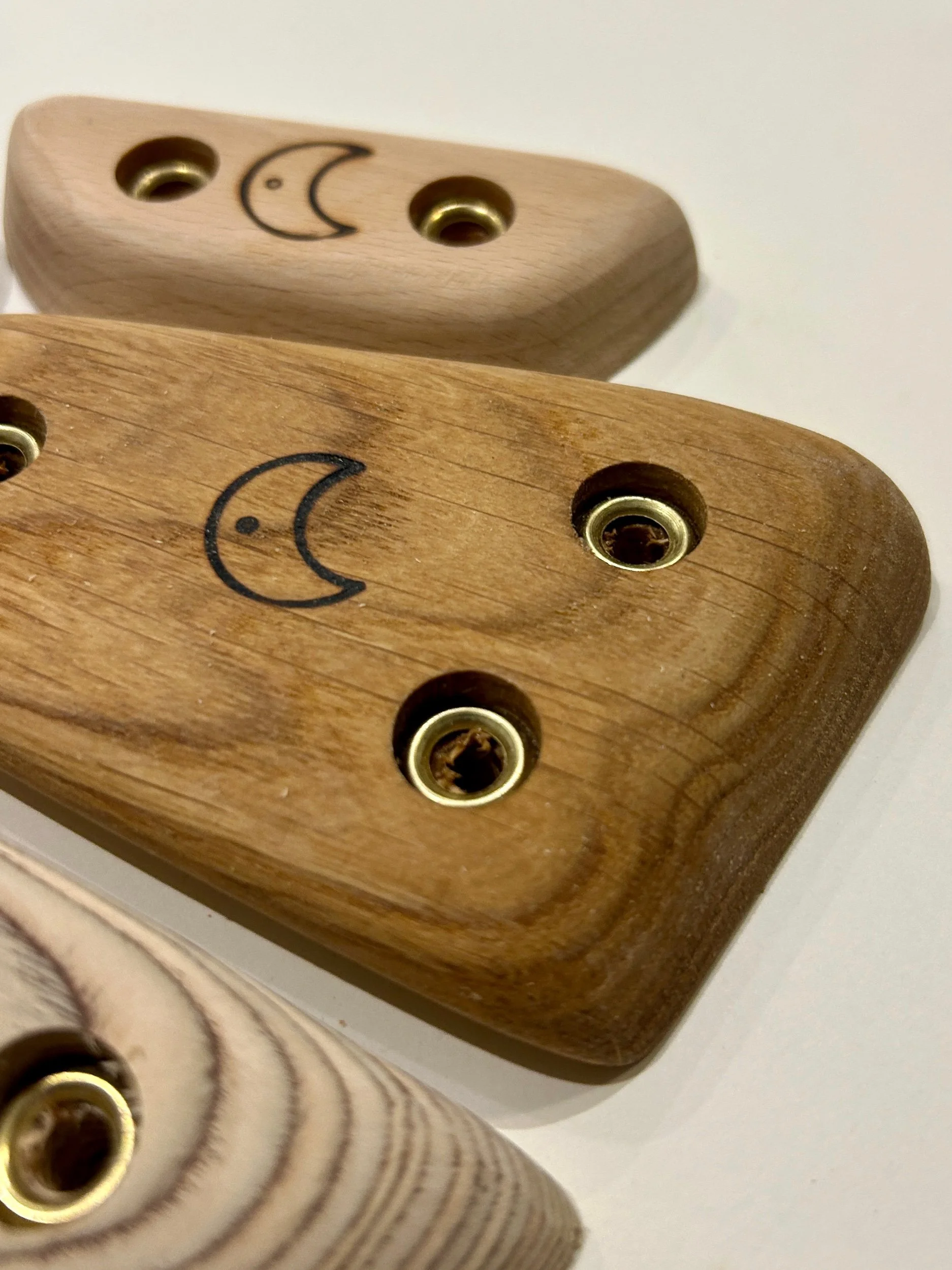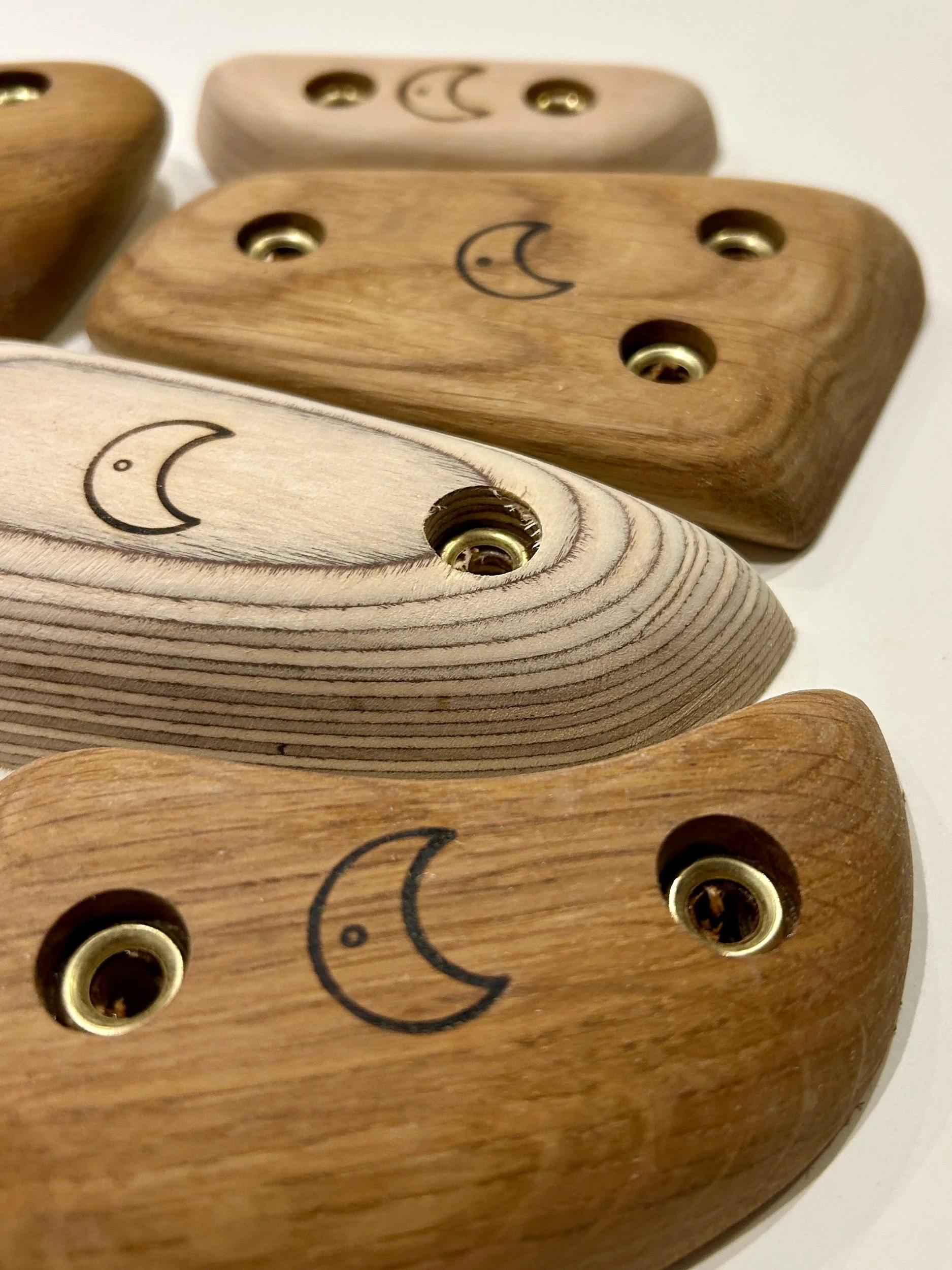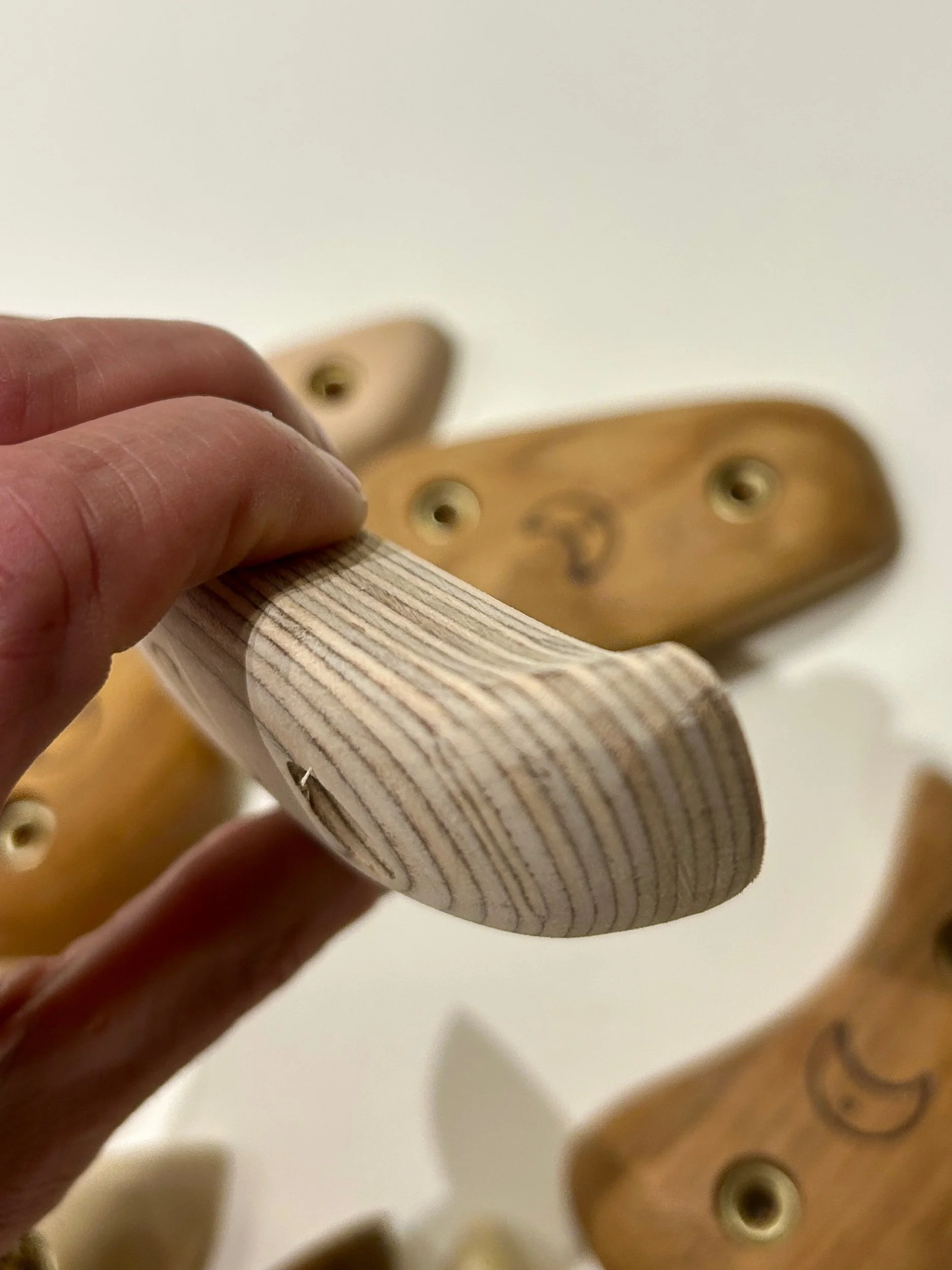 Beautiful handmade wooden climbing holds, brushes and training equipment.