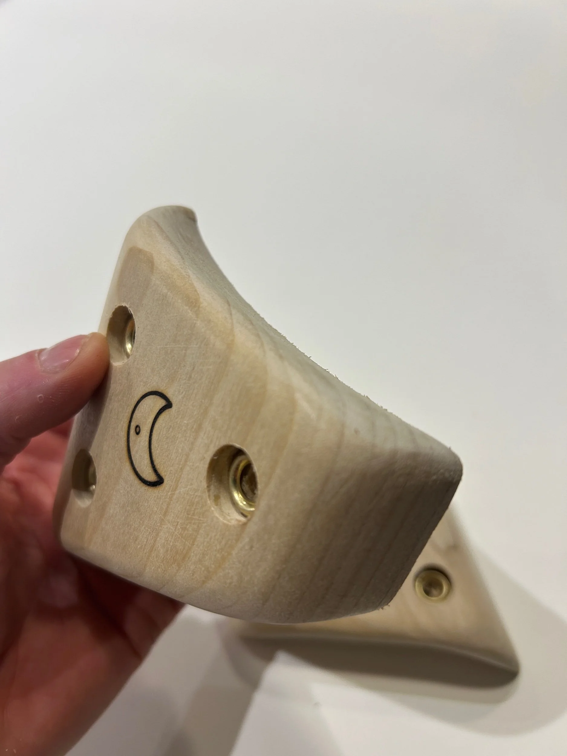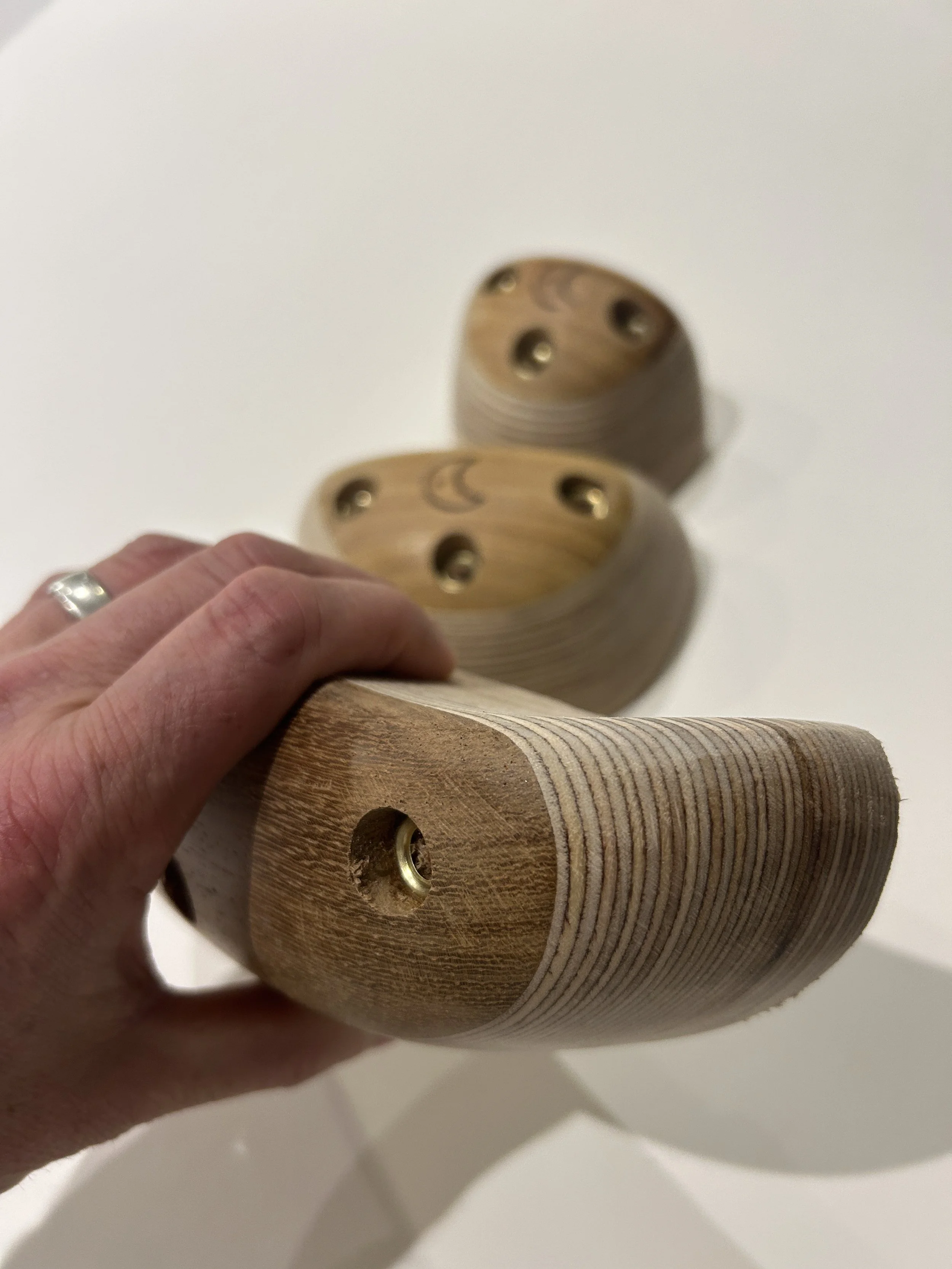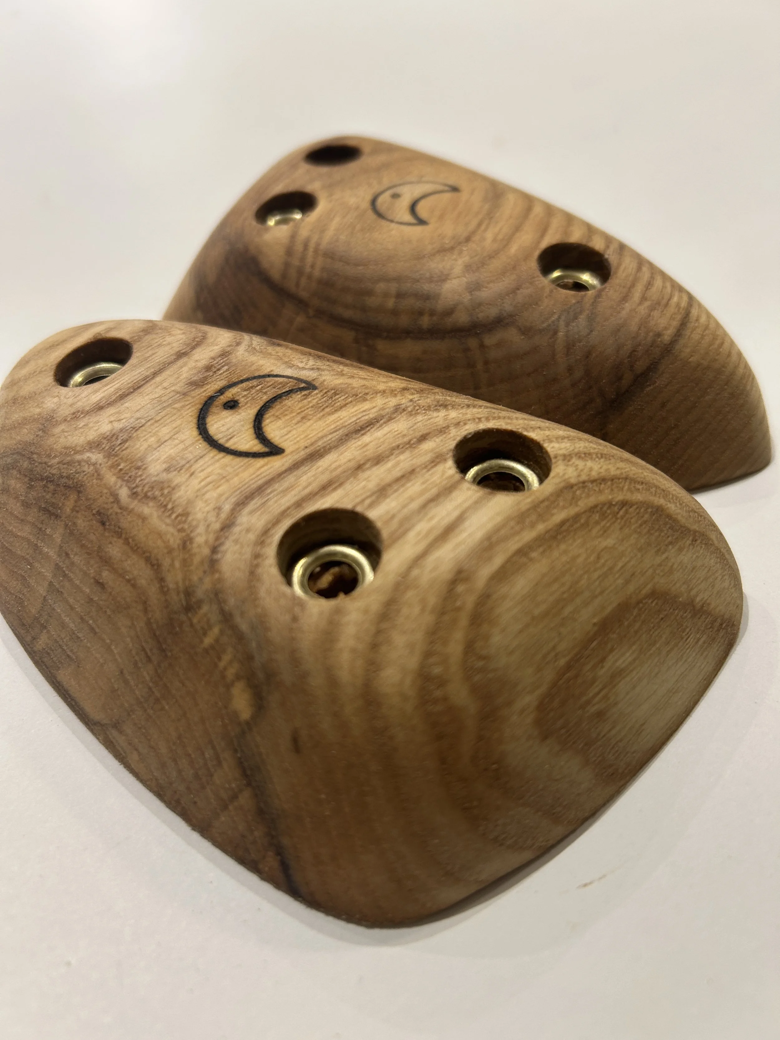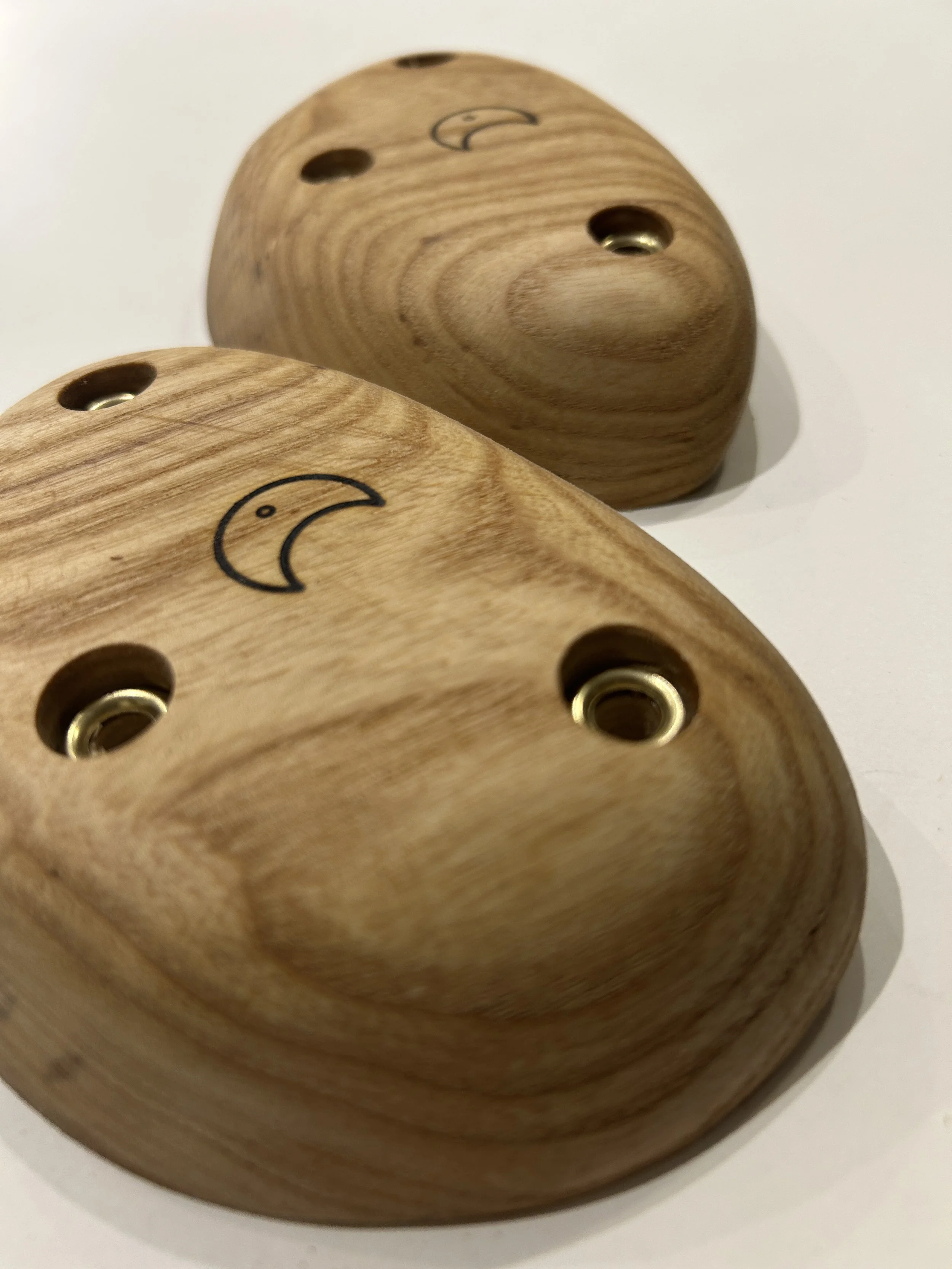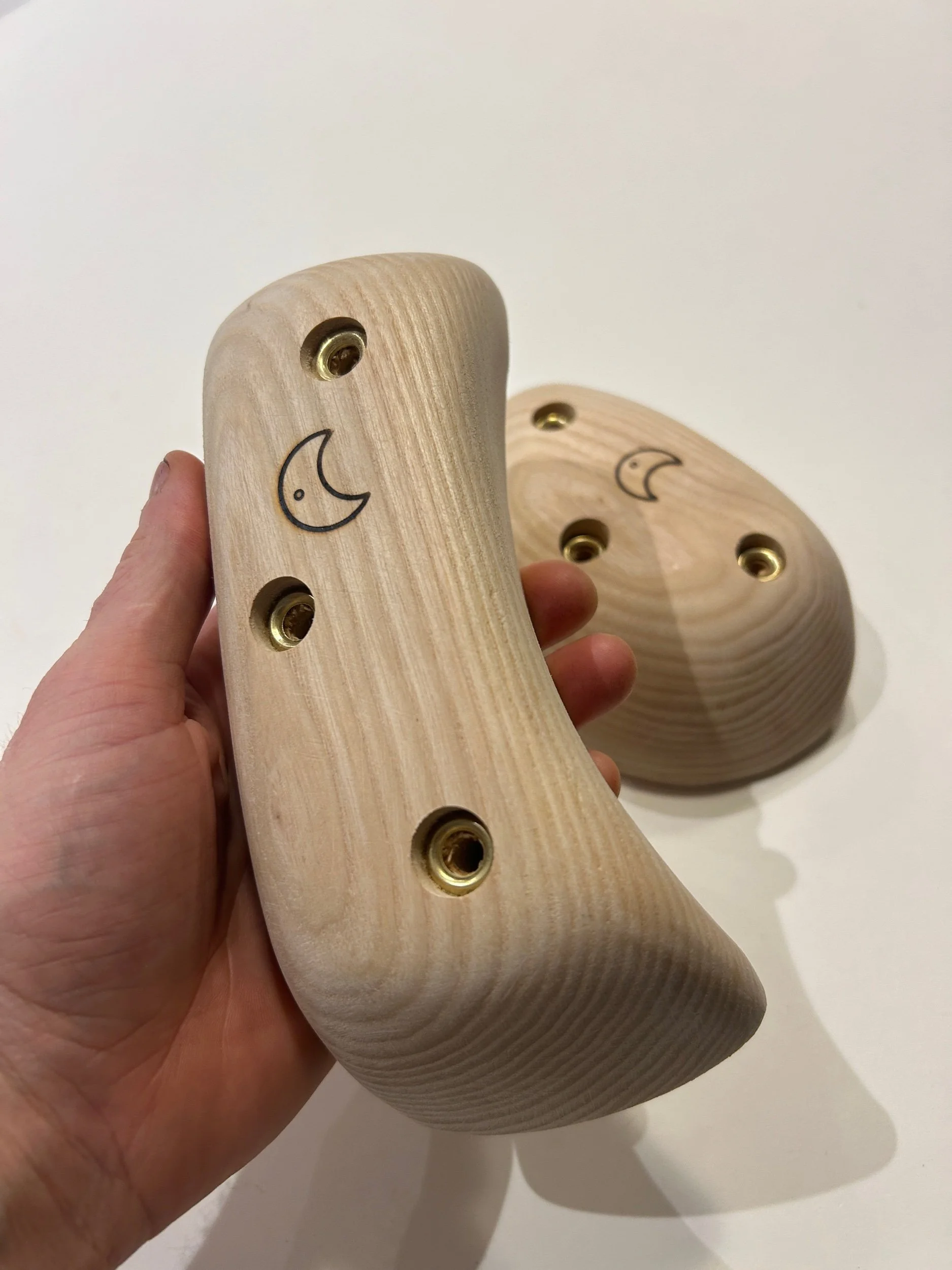 Beautiful handmade wooden climbing holds, brushes and training equipment.