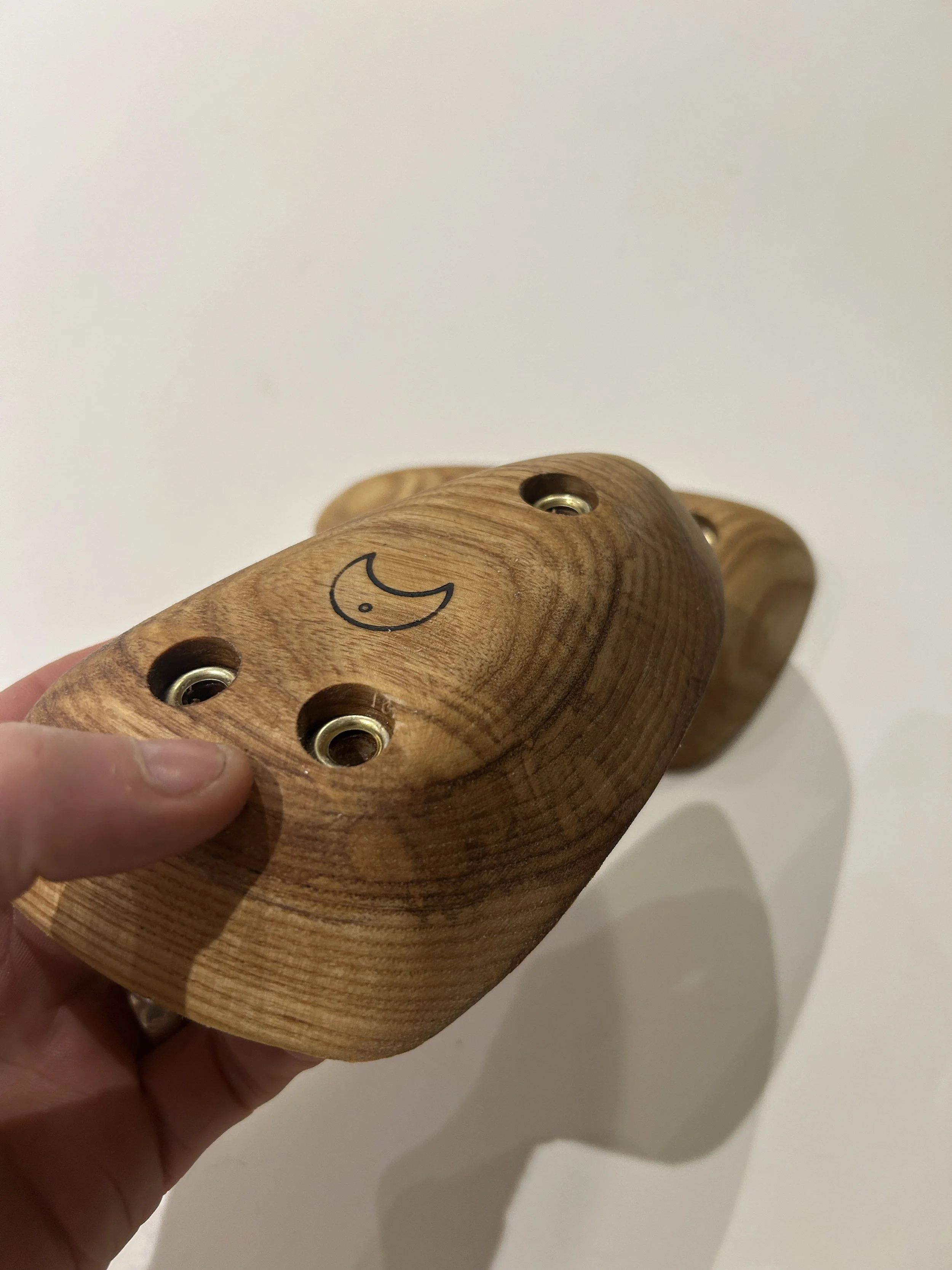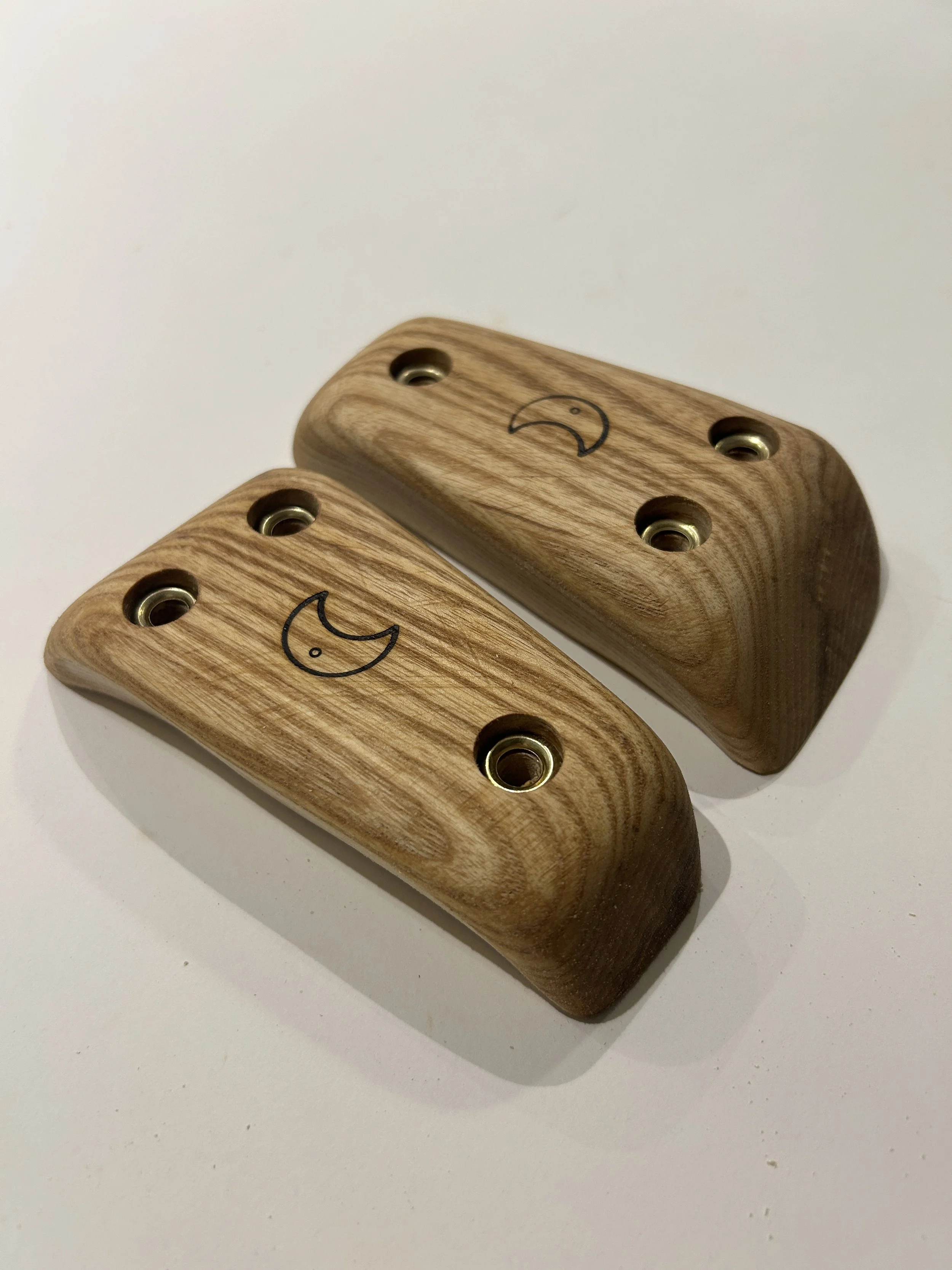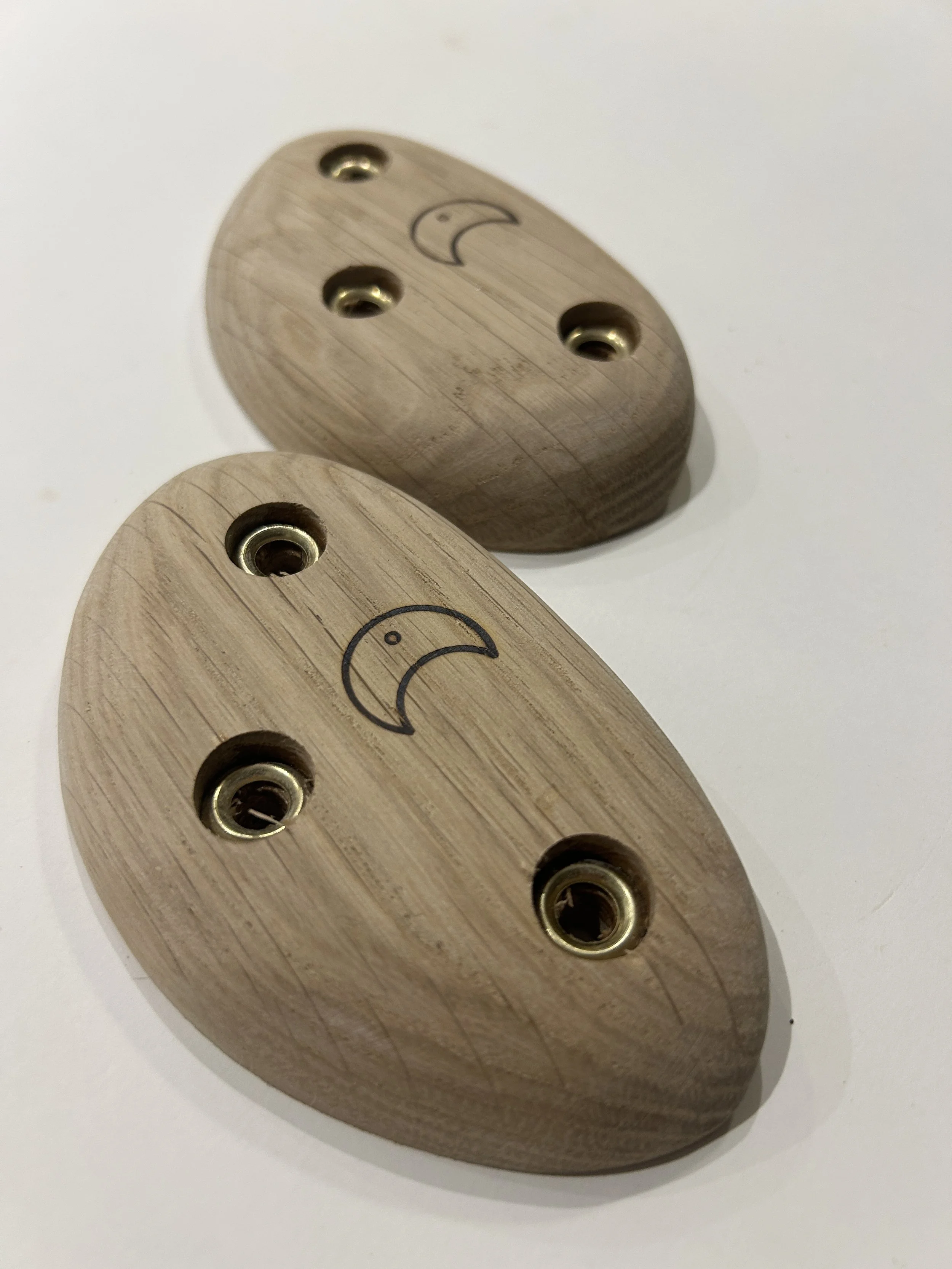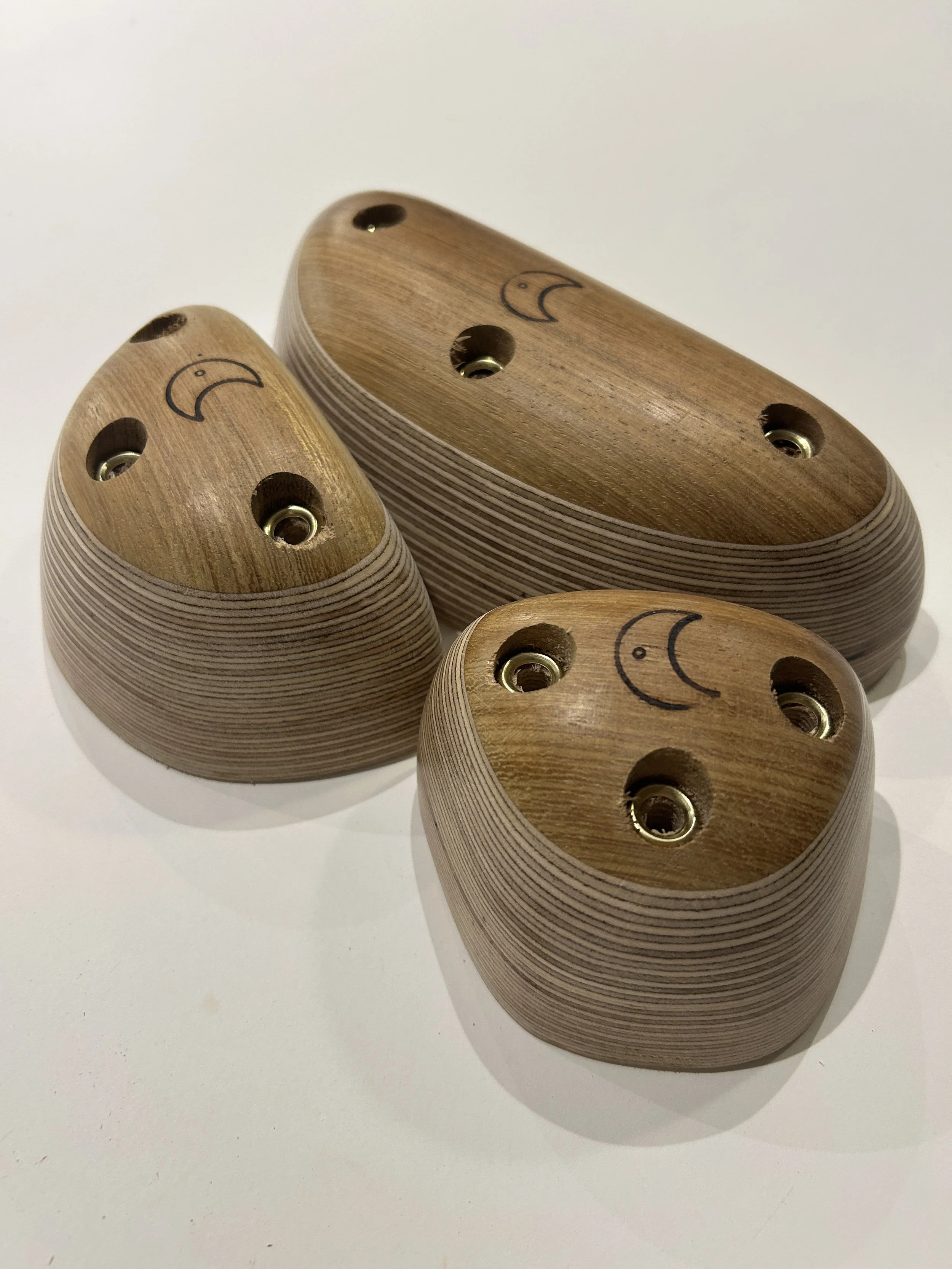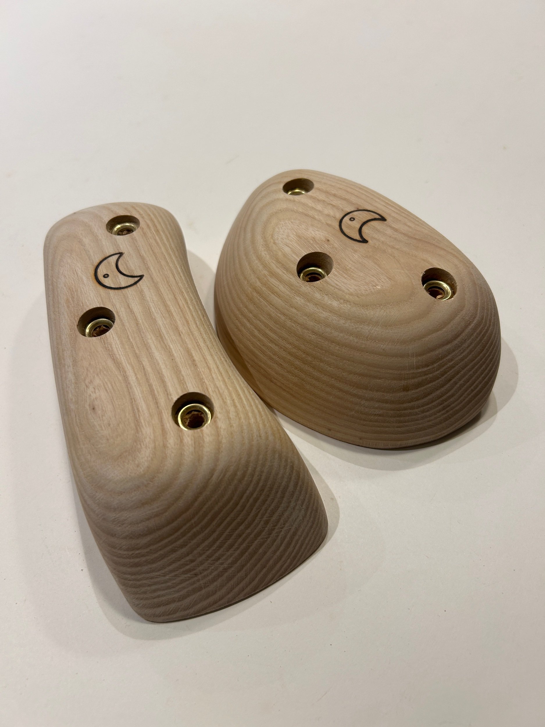 Beautiful handmade wooden climbing holds, brushes and training equipment.