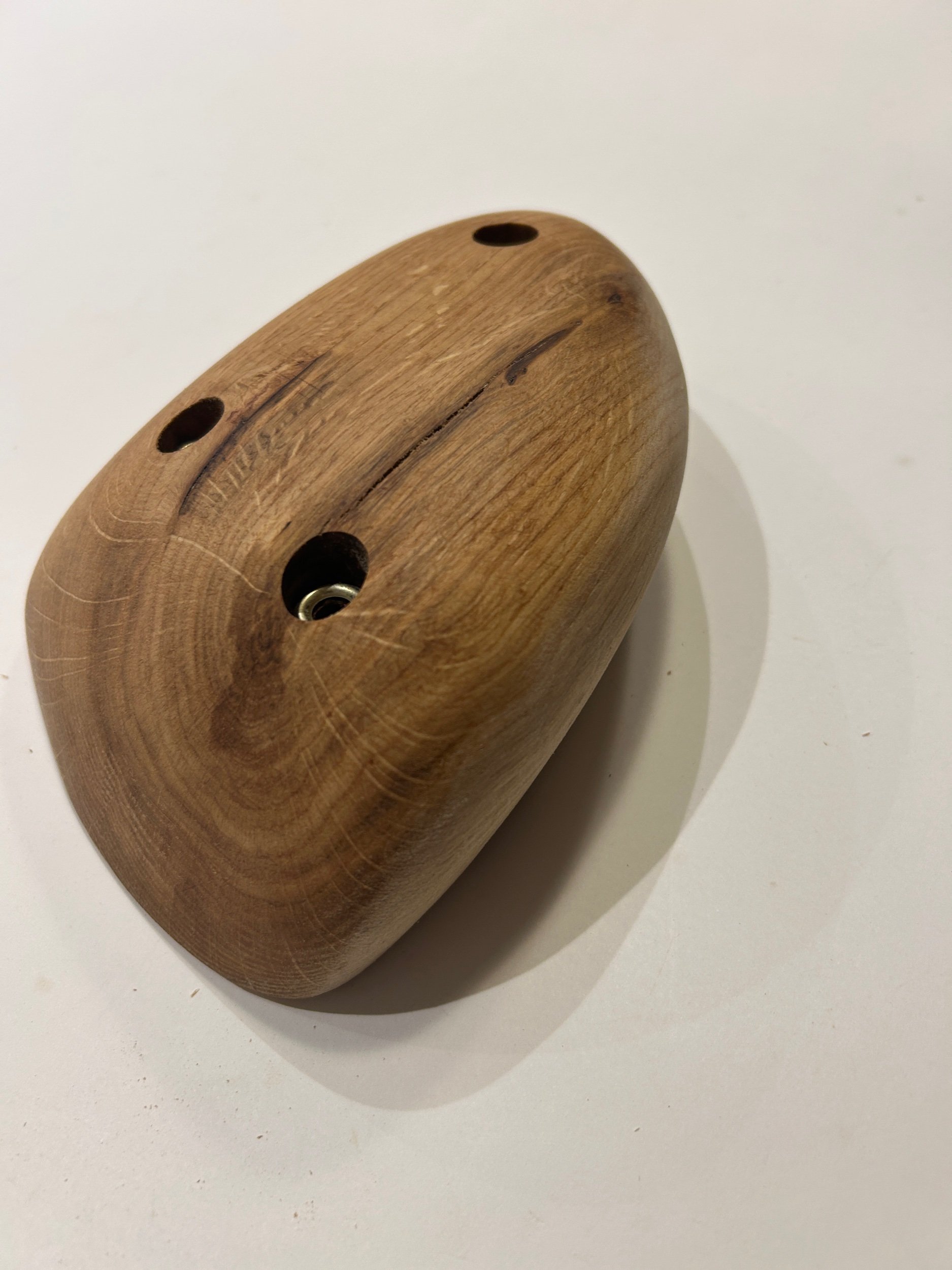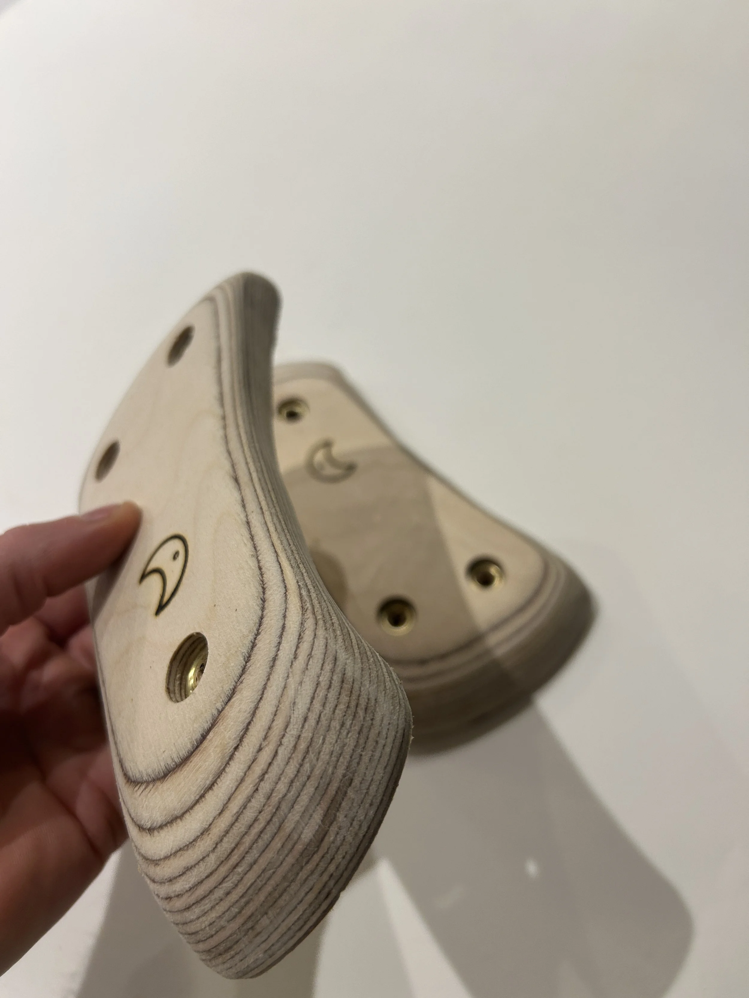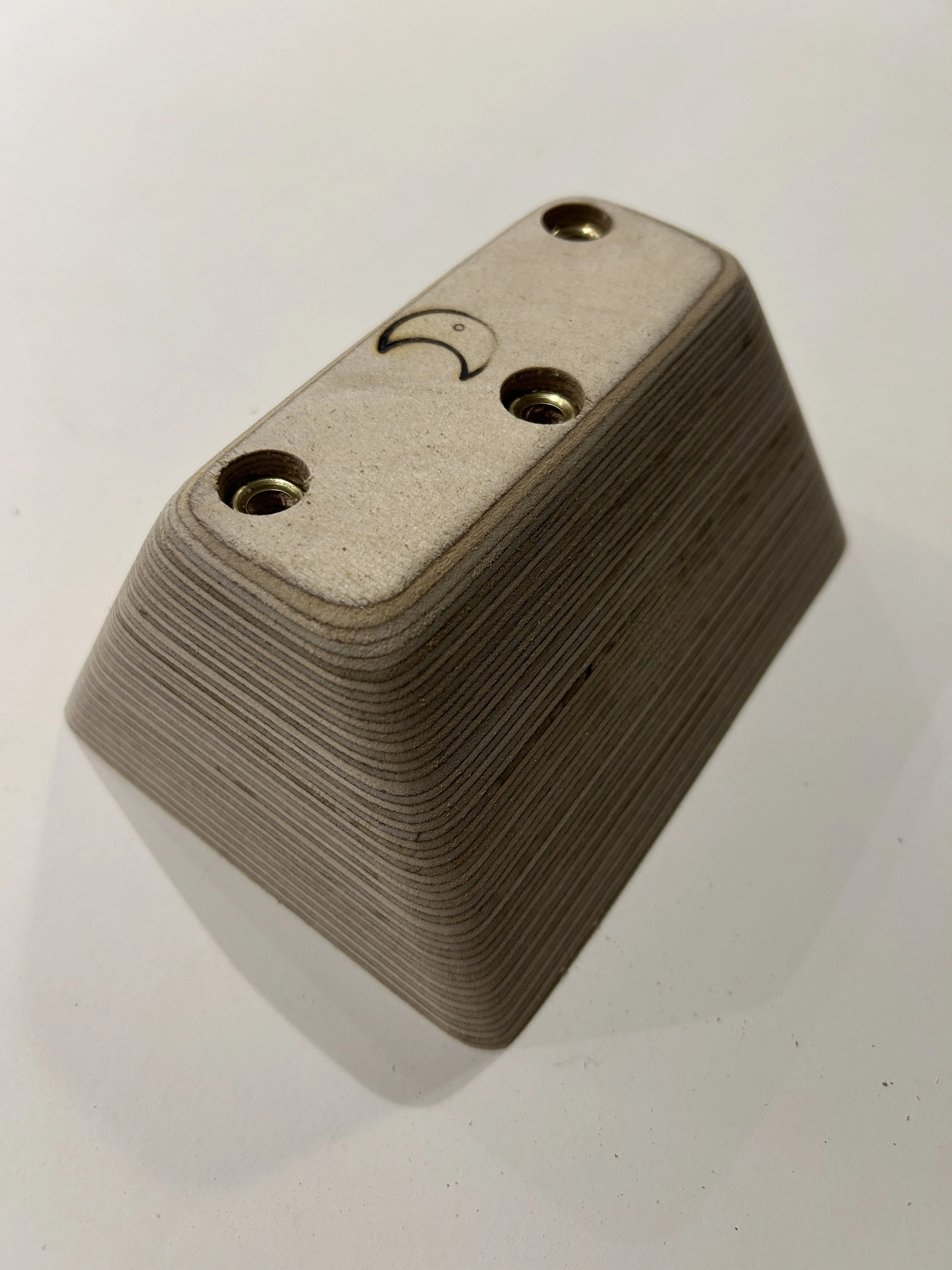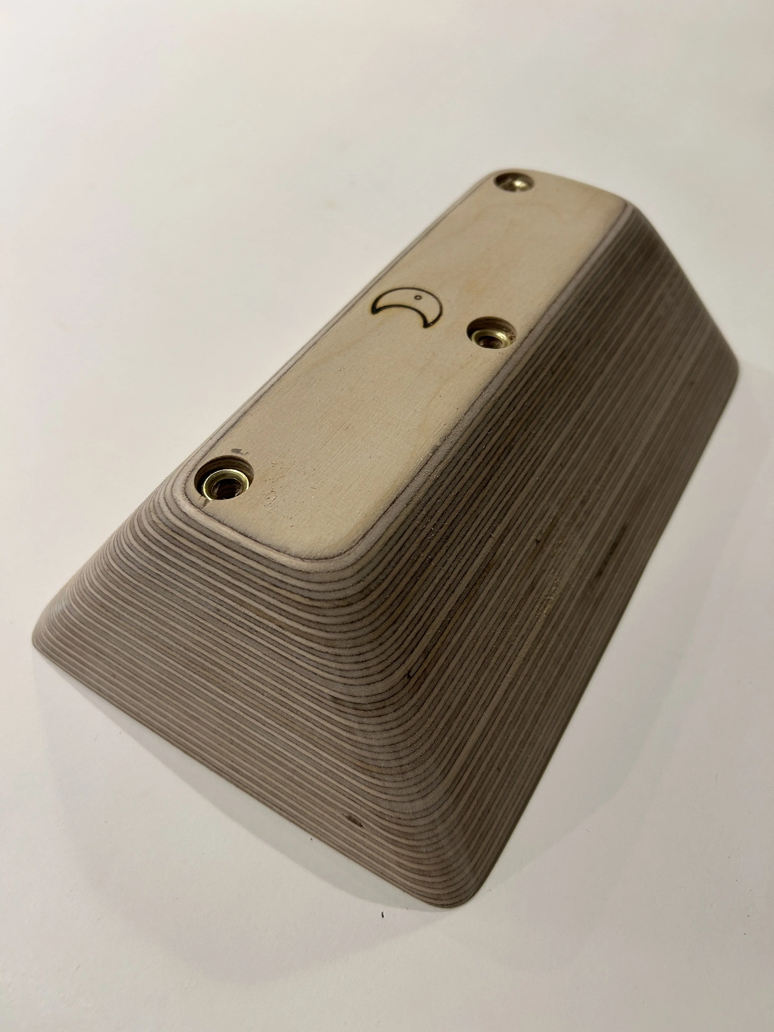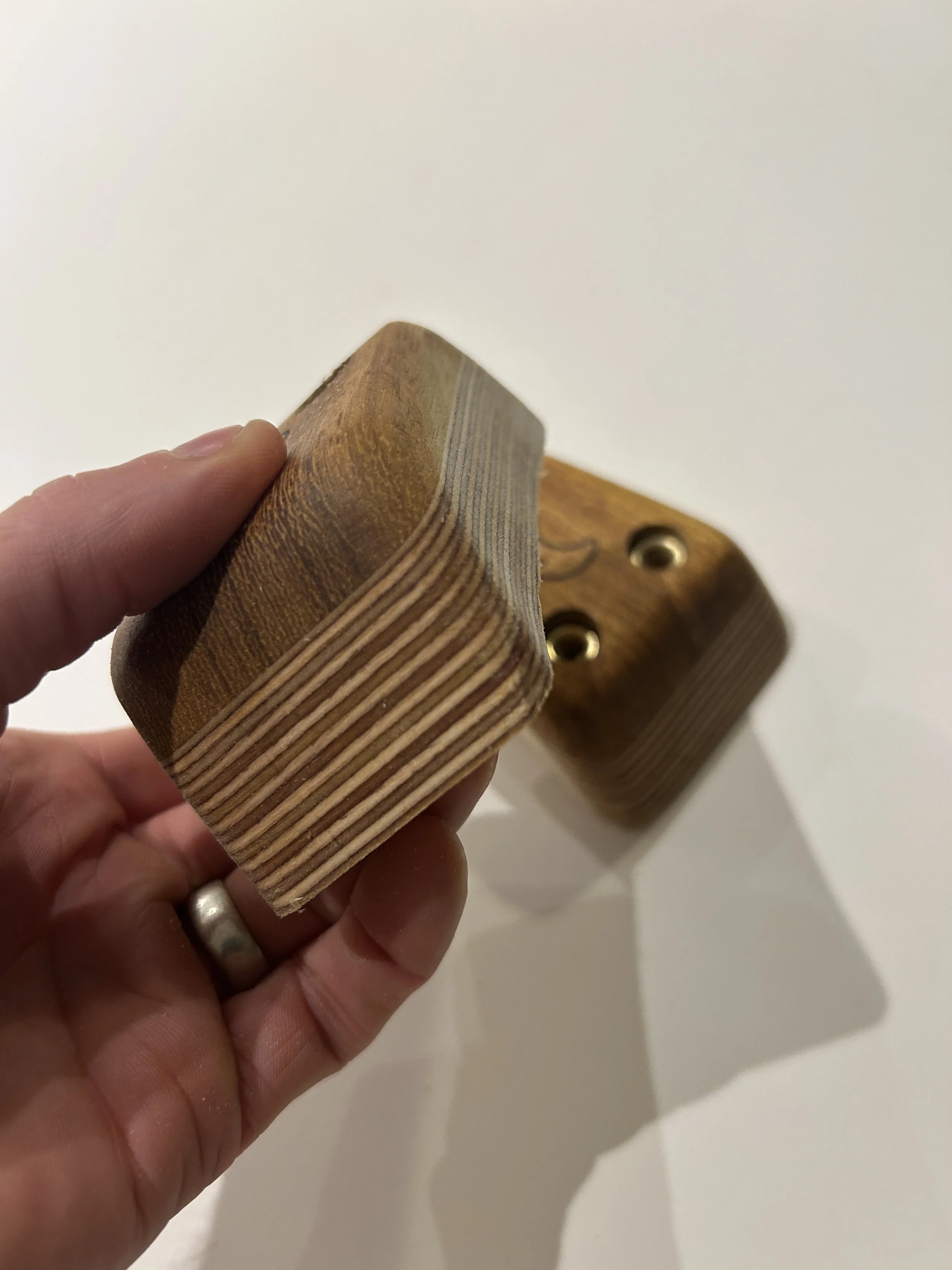 I make our holds, brushes and training products from various hardwoods and plywoods, all of the wood comes in the form of offcuts or is reclaimed, the aim is to create no waste. I shape every hold by hand in my small workshop at the bottom of my garden in Brighton. Sometimes I set out with a plan for a particular set. Sometimes I let the grain and characteristics of the wood dictate the shape. I test out all our hold designs on our garage spray wall, developing and refining as I go.