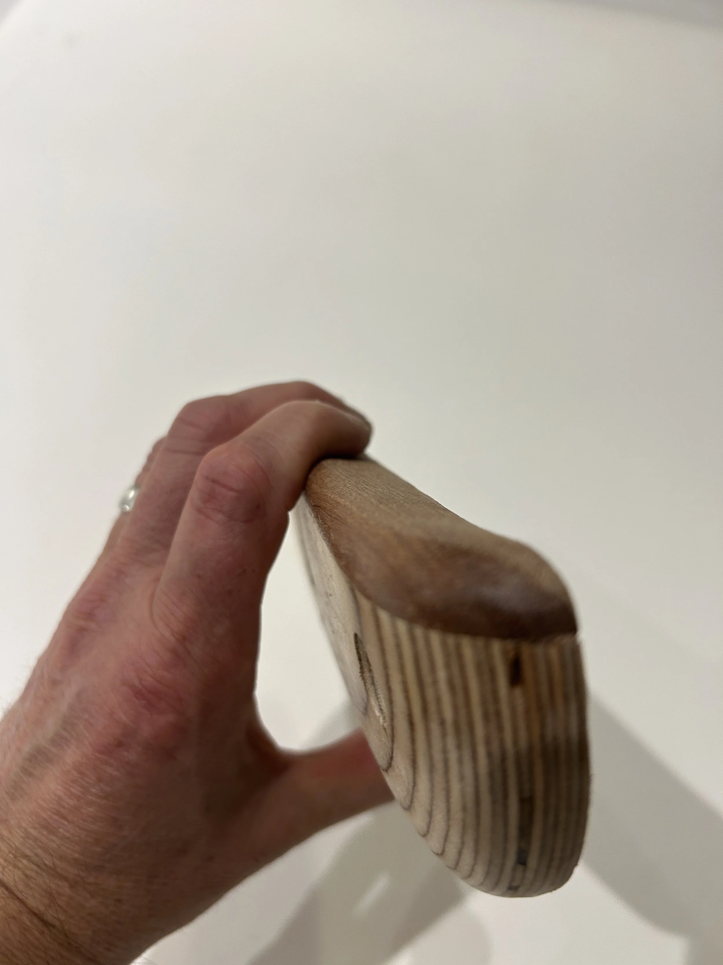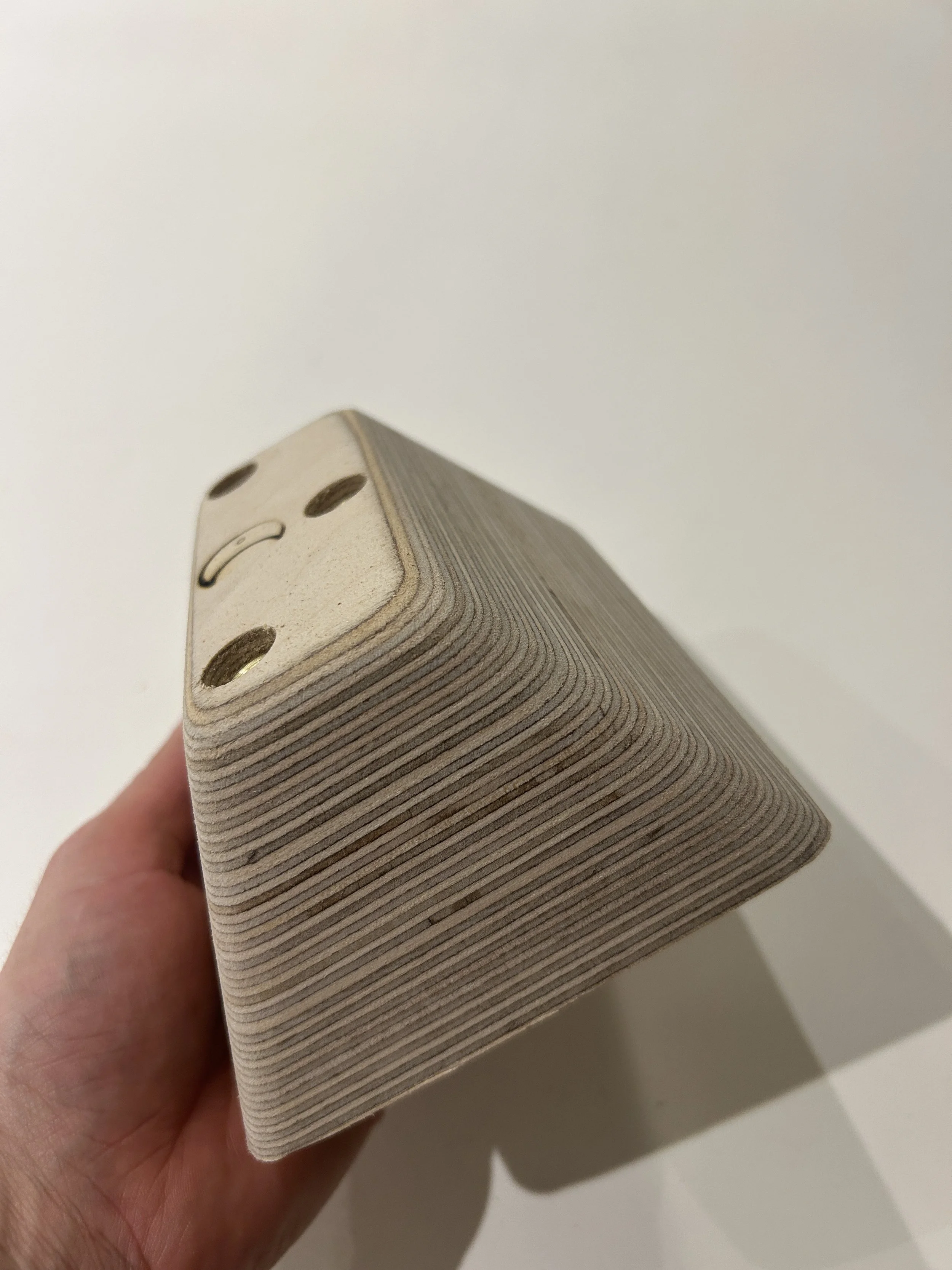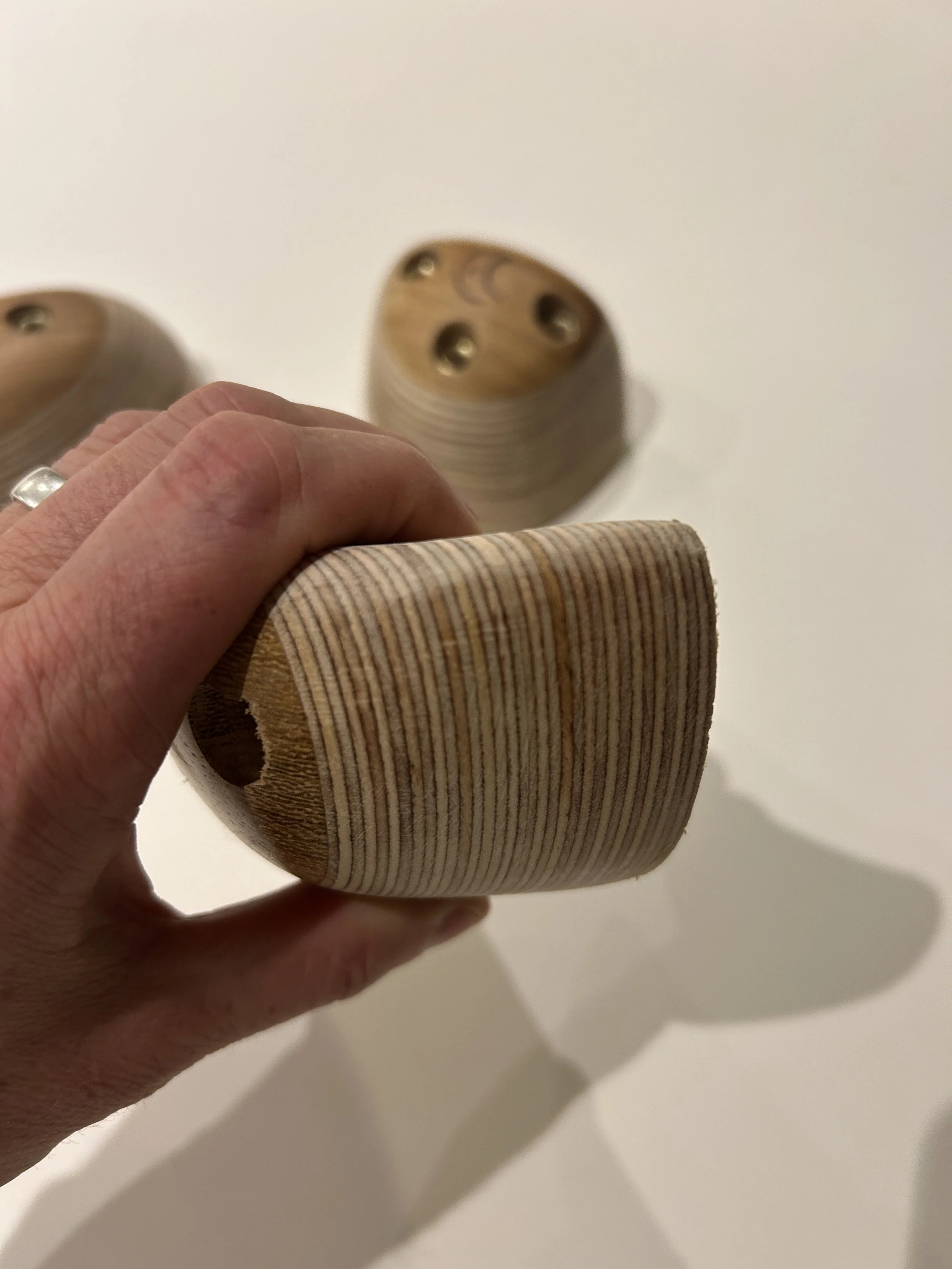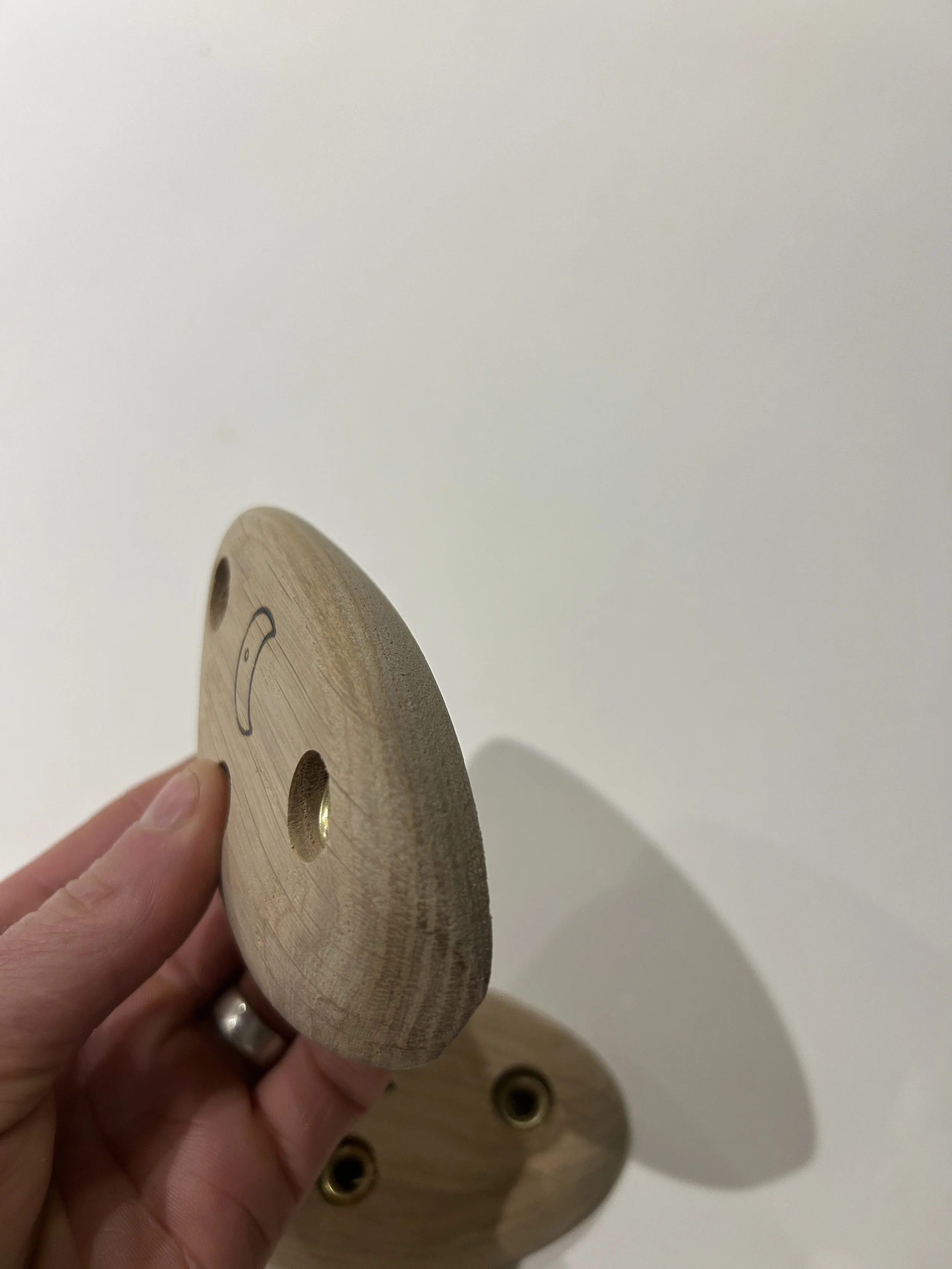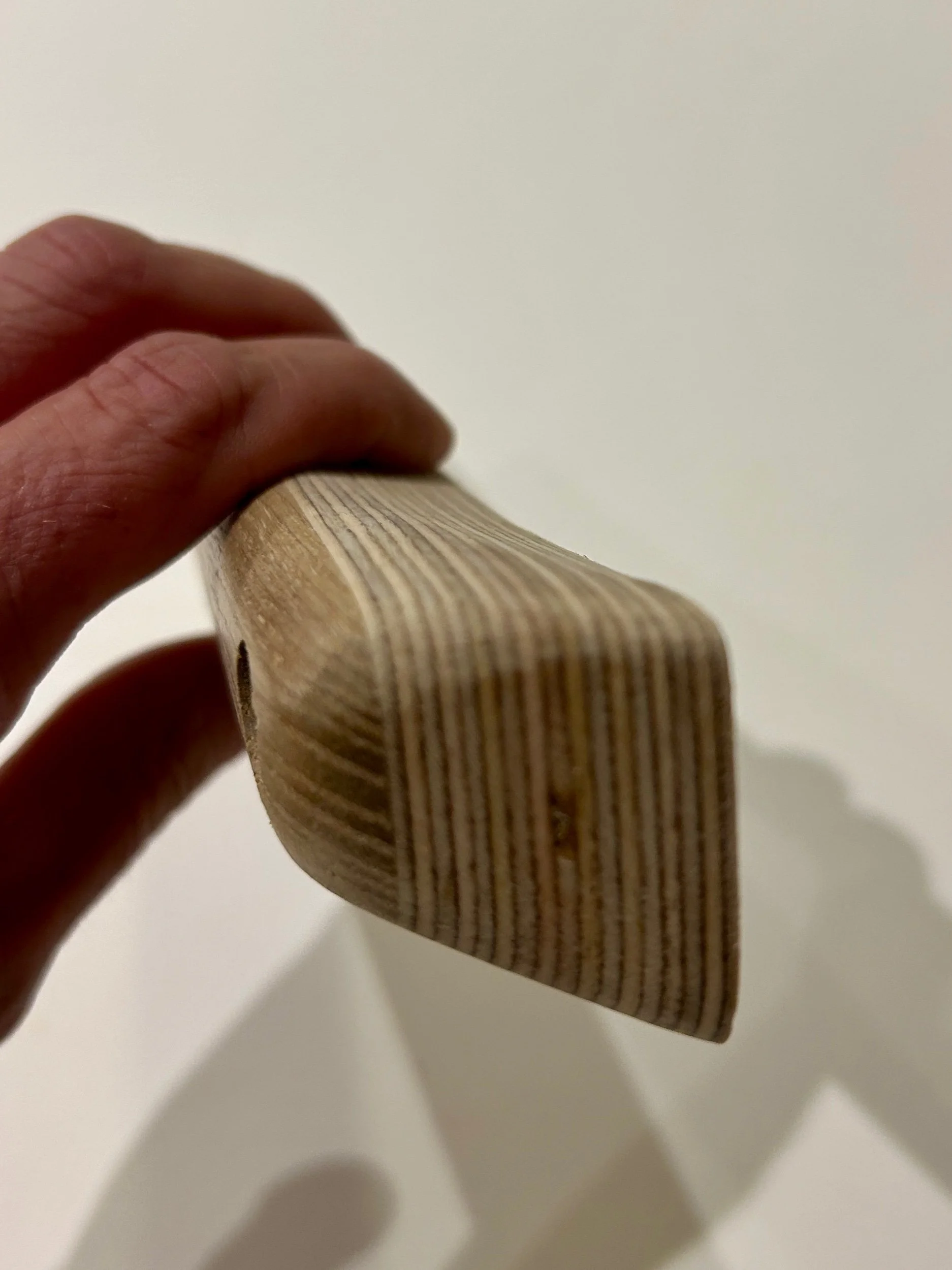I make our holds, brushes and training products from various hardwoods and plywoods, all of the wood comes in the form of offcuts or is reclaimed, the aim is to create no waste. I shape every hold by hand in my small workshop at the bottom of my garden in Brighton. Sometimes I set out with a plan for a particular set. Sometimes I let the grain and characteristics of the wood dictate the shape. I test out all our hold designs on our garage spray wall, developing and refining as I go.
